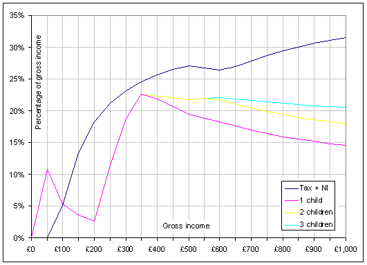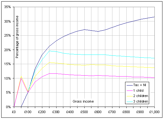 At face value, that is a very objectionable statement for a number of reasons. She may simply have meant that, for non-resident parents, paying child support should be as inevitable a paying taxes. She may have intended to make a specific point to some particular audience. Or she may simply have been mis-reported. That comment prompted this article to compare child support assessments with income tax & NI assessments to see if any conclusions can be drawn. Comparisons between paying income tax + NI and paying child supportThe majority of people pay income tax and National Insurance, and appear to manage. Why do child support payments appear to cause more problems? Are the issues to do with the amounts, the timing, the combination of deductions, or other reasons? First, this article compares the amounts deducted from the gross income for these different purposes. Later, the results are discussed. Notes: unlike other comparisons, gross income not net income is used here. The income tax & National Insurance rates are those for 1999-2000. 1 - Comparison between income tax + NI and the current scheme