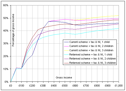 For an NRP initially on £200 gross, earning an extra £150 would leave an extra £27 after all these deductions. Indeed, increasing earnings by £50 from £250 to £300 would leave just over an extra £5! These earnings cover the range from well under to well over average NRP earnings ( which is £207 net). They represent earning at which in other circumstances NRPs would probably be trying to "better themselves". These deductions simply make it financially hardly worth it! It must be particularly galling if the PWC is on Income Support so the children don't benefit from any of the extra money paid. They certainly make it worth while doing everything possible to hide any increased earnings! No wonder some NRPs discuss hiding overtime. Another important issue is that if the CSA makes a mistake, or uses income figures which are no longer representative, the consequences can be very large. Even the reformed scheme doesn't behave as well once income tax & NI are included. All the talk is about NRPs paying 15% / 20% / 25% of their net income. In fact, only about a quarter of them are likely to do so, and many of the rest will be in the region where from half to two-thirds of anything extra they earn will be deducted in total. Here is a similar table for the reformed scheme for an NRP with 3 qualifying children: