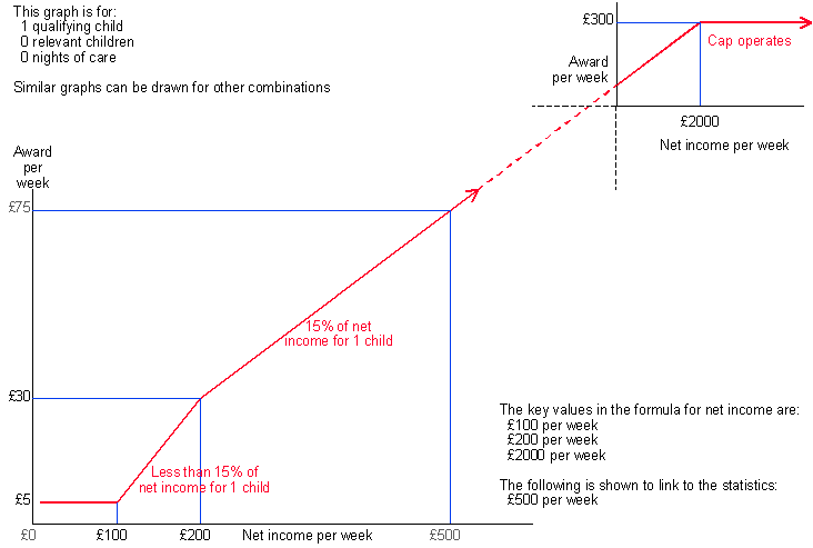 In the diagram below, the red line is the formula for what the nonresident parent pays if there is one qualifying child, no other relevant children in the nonresident parent's household, and no significant amount of over-night sharing of care. For net incomes from £200 per week to £2000 per week it is indeed 15% of net income.