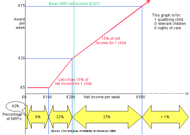 What this shows is that the mean net income of nonresident parents is little different from the point where the 15% / 20% / 25% formula kicks-in, and nearly three quarters of nonresident parents (see the numbers in the 2-headed arrows near the bottom) earn less than that amount. In fact, more than half of nonresident parents only earn enough for the new formula to calculate £5 per week. These figures are taken from the CSA Quarterly Summary of Statistics for November 2000 [1]. The new formula hasn't started yet. Are those figures representative for the new formula? In fact, in those statistics a key definition is: