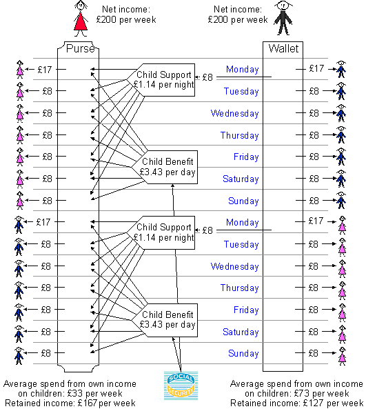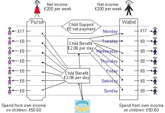 ComparisonEvery parent has exactly the same care of children and exactly the same cost. Where Jack & Jill retains a child permanently, they are financially equal (as they should be). The White Paper says "Where parents have separated and one or more of their children live with each parent, both parents are non-resident parents - and both are parents with care. In his situation, we will assess the maintenance liability of each parent. Only the difference in liabilities will be payable." An excellent attitude. But where Mack & Mabel attempt to share each child exactly equally, the bizarre White Paper equal-sharing formula steps in. The result is that fathers like Mack who try to share their children equally might find themselves £40 per week worse off than mothers like Mabel. Why doesn't the White Paper use exactly the same logic that it applied where children were permanently living with particular parents? (This question ignores the probability that the answer is "it was an accident and we couldn't be bothered to fix it!") First, because of the bias in the benefits system which awards Child Benefit to the mother by default. Second, because of the truly weird feature of the White Paper that insists that even where parents share the care of a child exactly equally, one of them must be the parent with care and the other must be the nonresident parent, even if everything is exactly equal. (Why?) This results in the unjustified £8 child support. There is no logical difference between the Jack & Jill case and the Mack & Mabel case. Every parent earns the same, every parent cares for his or her children the same, and each parent spends exactly the same on their children during direct care. So why don't they all end up the same? Because the White Paper shared-care proposal is ridiculous! And the benefits scheme leaves a lot to be desired. The Fair Shares formula balances out the child support for Mack & Mabel just as for Jack & Jill. There becomes no net liability. (Only the benefit anomaly remains). This is an HTML transcription of an article written in September 1999, hence the benefits rates, the references to the White Paper, etc. |