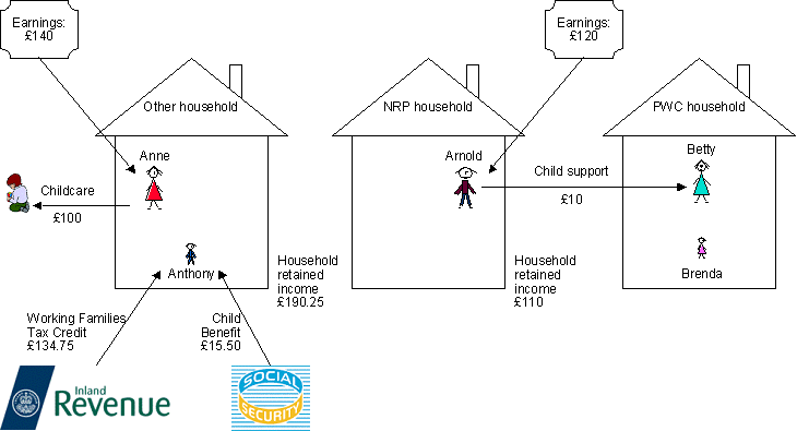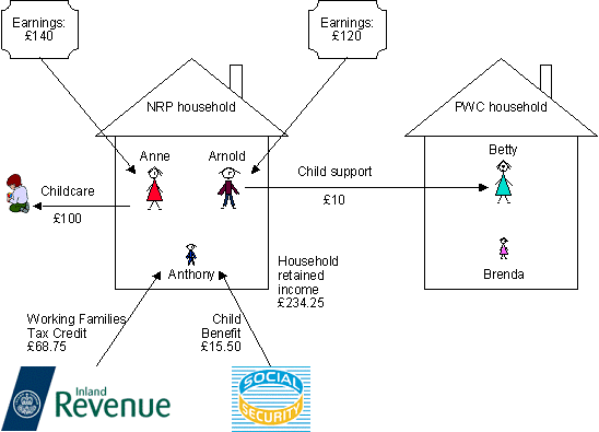 The NRP has a new partner. She has a young child (it doesn't make any difference here whether it is also his child). He works. She works and earns more than him. They are entitled to claim Working Families Tax Credit (WFTC). They have to use childcare for the child because there is no one left at home to look after the child. But they can claim some of this back from the WFTC scheme as childcare tax credit. |