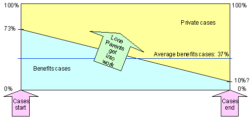 The diagram below shows the way that CSA cases shift from being benefits cases to being private cases during their lifetime. (Some simplifying assumptions were made).