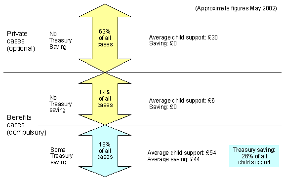 Now, it is time to accept the switch entirely, and cease the corrosive compulsion remaining in a proportion of cases. Note that the proportion of CSA cases that are benefit cases does not show how many CSA cases started as benefit cases. About 73% start as benefit cases, then many of those become private cases later when the parent with care gets back to work. Often, the case is a benefit case for only a small proportion of its life, but by that time the damage has been done, and at the most fragile time in the new (separated) relationship between the parents. How?Implementation would be easy! (It is only the decision to do this that needs work). It is initially simply a matter of removing Income Support and Job Seeker's Allowance (income based) from the list of benefits that trigger CSA cases. Eventually it might involve removing the option of compulsion from the law, but that requires a bit (not much) more work. Although Treasury savings would be reduced a little, the move would probably be welcomed by all informed lobby groups and citizens, with none of them dissenting. And there is evidence from elsewhere that reducing the Treasury saving increases the compliance, hence improving the outcomes for the children. NumbersThe diagram below shows approximately what would happen if the cases at May 2002 were all moved across to the reformed scheme without phasing. (Some simplifying assumptions were made).