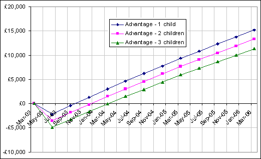 Unlike most other cases, the largest effect is for 1 child. That is really a consequence of the way the new scheme's cap operates. Instead of being influenced by the maintenance requirements for the children concerned as in the current scheme, it simply operates at a single net income level (£2000 per week), and so tends to reduce the differences resulting from extra children. Note - the advantage to the parent with care (the difference between the intended and premature conversions) is nearly £100 per week if there is just one child. Few people actually spend this amount in total on one child! Allowing a £100 per week loophole for better-off parents, while the same loophole is not available to a parent with care on Income Support who would anyway only be better off by up to £10 per week, is unfortunate. |