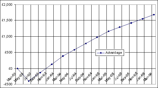 This version of the graph shows more clearly that in this case the advantage is still increasing after March 2006. That is because not only has there been premature conversion, but the phasing-in has been bypassed.